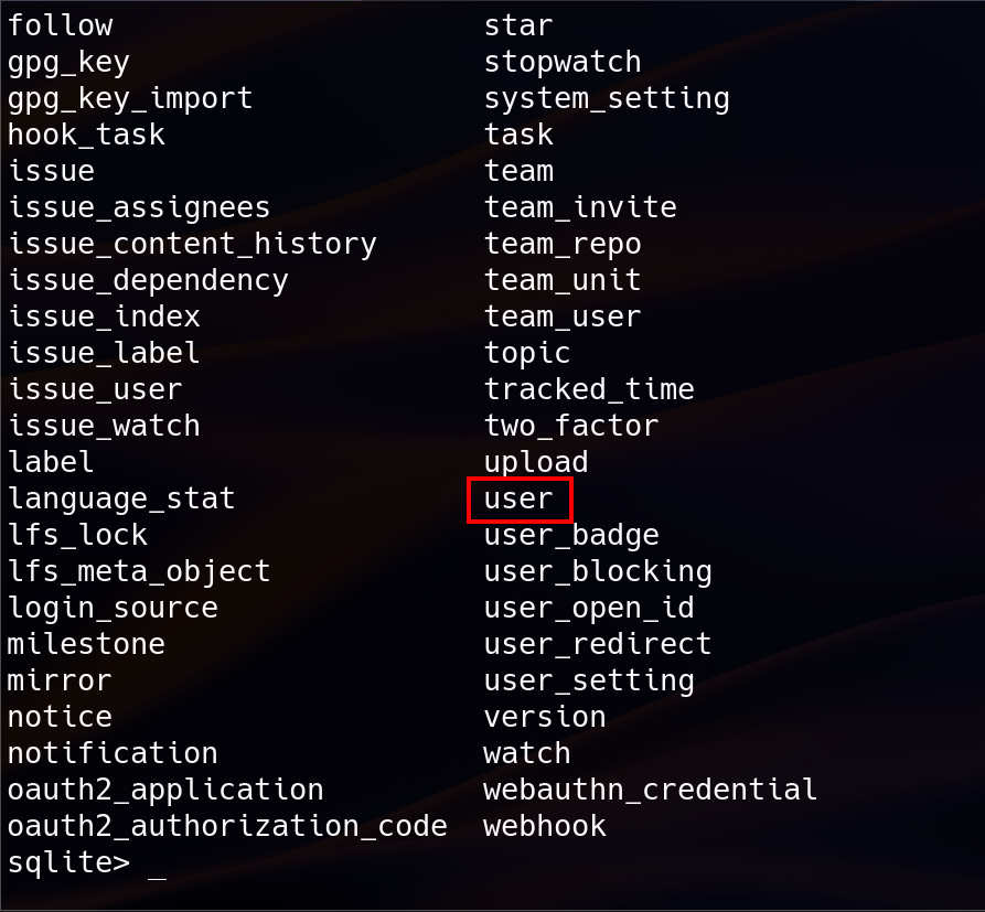 After downloading, the database was examined using SQLite3. A list of tables revealed the presence of a user table. The user table is particularly critical, as it stores the hashed passwords and other sensitive data that are used for authentication. This table, along with others, is documented in community write-ups and can be verified by examining the Gitea source code or related documentation. The following SQL query was run to extract credentials : SELECT id, name, email, passwd, salt FROM user;.